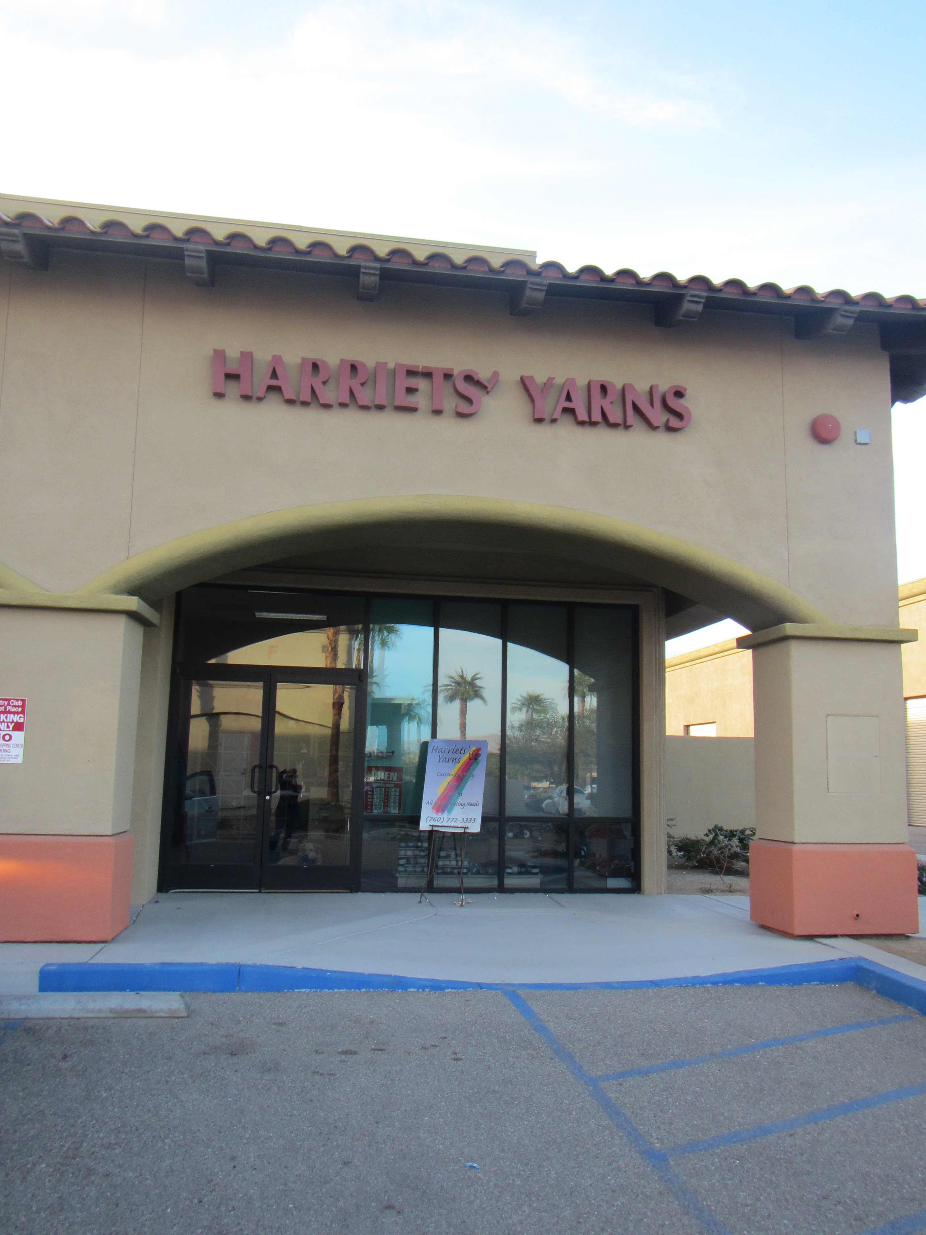 I needed some needles to stitch up the Diamond Lace Mitts so I went online to find a yarn store in the Palm Springs area. There was not a lot to choose from and the one called “Harriets’ Yarns” in Palm Desert was an obvious choice–my bff is named Harriet. On the map it looks like Palm Springs, Cathedral City, Rancho Mirage and Palm Desert are close together, yet when you are driving down Ramon Avenue and then Bob Hope Drive and then Country Club Drive, stopping at all of the lights, it feels a lot further. At last we found it in a large shopping area. (Just noticed the apostrophe seems to be misplaced or there is more than one Harriet!)