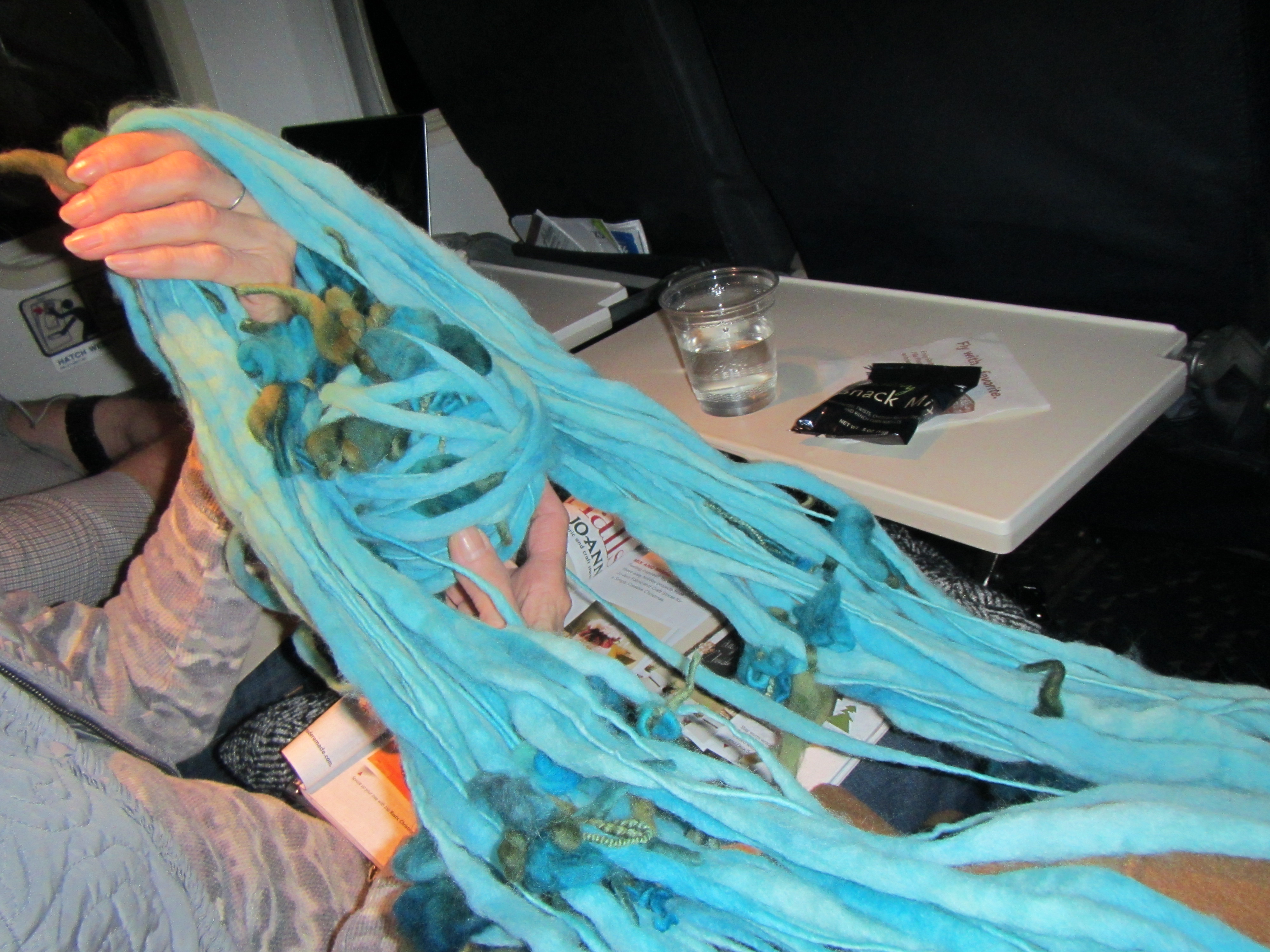Then I found this beautiful hand spun wool by Pagewood Farm called Garden Party. The color is called Sante Fe, yet reminds me of the colors of the sea. I have a good friend who has a group of friends that call themselves the mermaids and this particular yarn looks like something a hip and chic mermaid would wear. I bought the large skein and some size 19 needles. I found a pattern on Pagewood Farms website and knit it up quickly. I hope she likes it.