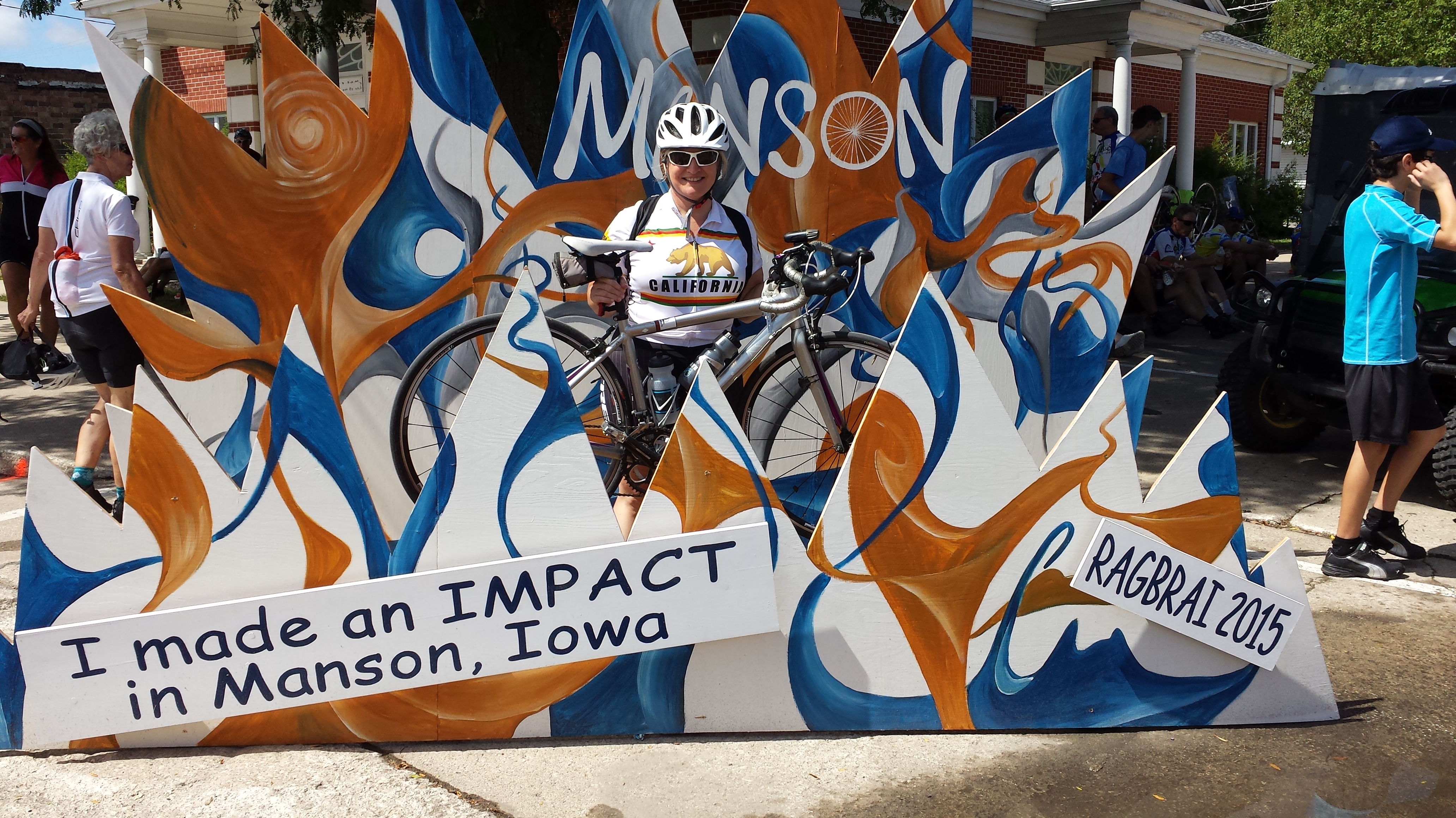 As I rolled into Fonda I was going slow and noticed that a local resident was kindly handing out bottles of water. The guy in front of me rode past her and then decided to stop all of the sudden without warning. I had my hands up on my handlebars and off my brakes and then it felt like slow motion. I went to the left to avoid him and saw the curb and a driveway full of people. I was saying whoa, whoa, whoa and this may have stopped the guy in front of him and I ran into him. We both began falling and thankfully I parted from my bike and kind of rolled. The people on the driveway gave me a 10 for grace. I was not hurt (just a couple of scratches) and my bike was okay. So was the other rider. The rider who started the commotion was extremely apologetic. This was my first RAGBRAI fall and the first on a road bike.