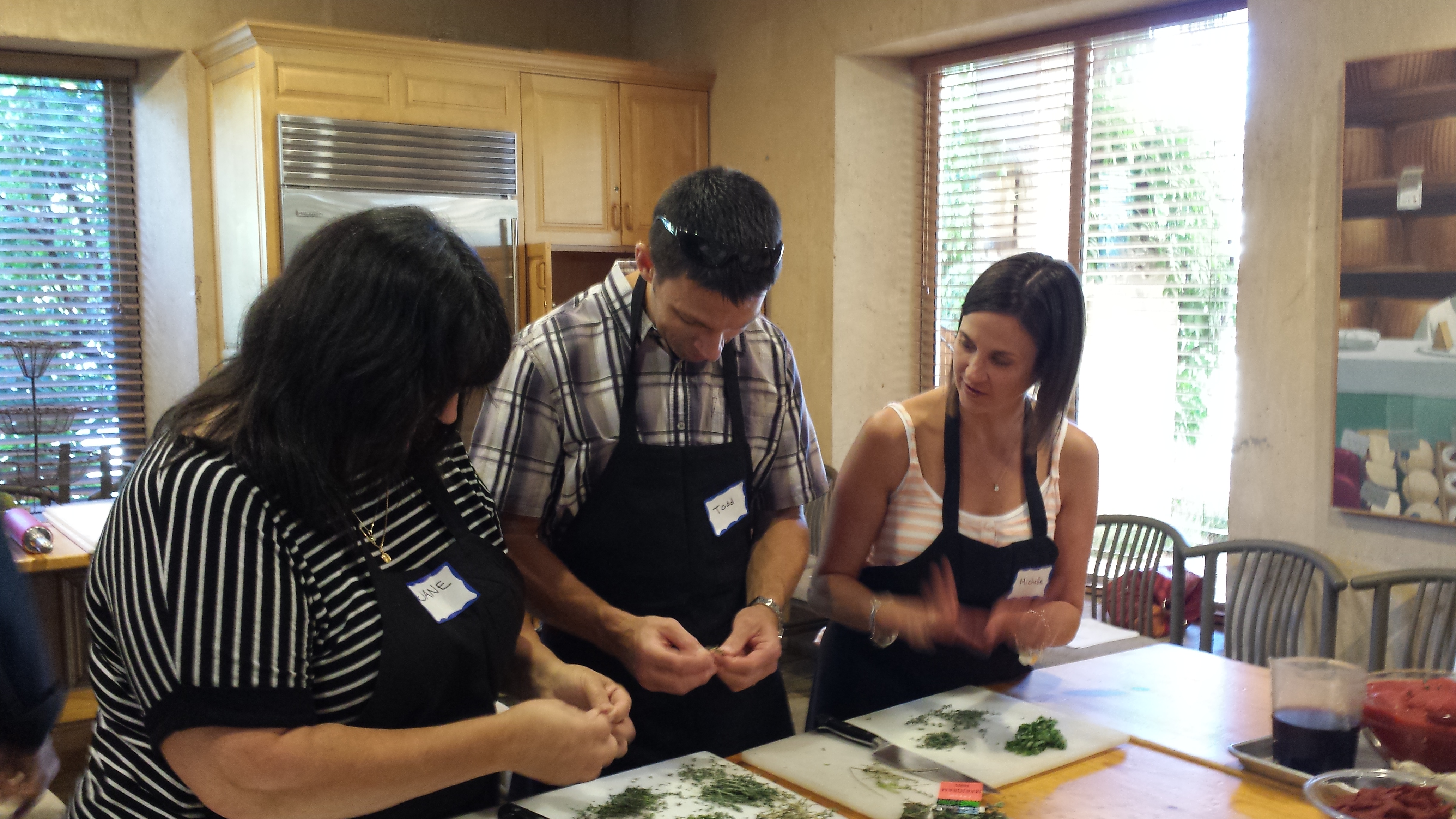 We arrived at Ramekins at the appointed time and signed in. The class was $95 per person for about 2 hours of cooking and then an hour of eating what we prepared paired with Sonoma wine. The classroom is set up for teams of 3 or 4 to work on various menu components.